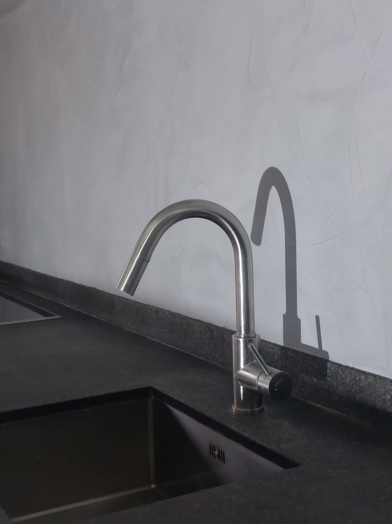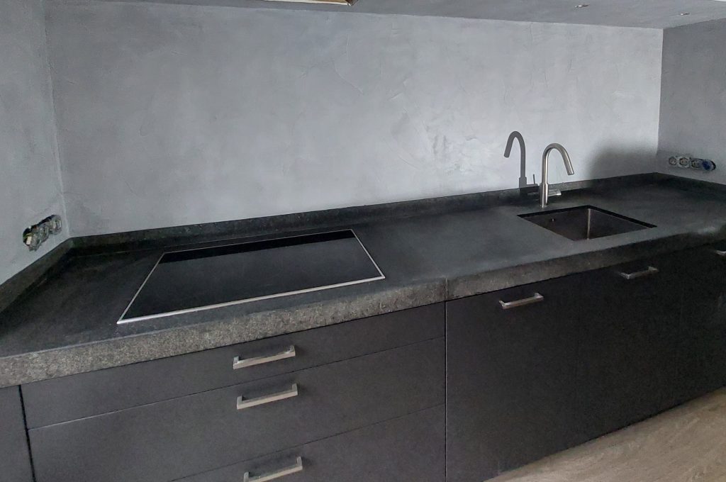 In Renkum heb ik deze keuken een nieuwe look gegeven. De achterwand was glas, het plafond was hout. Nu hebben beide vlakken dezelfde betonlook. Aangezien de rest van de keuken nog in zeer goede staat verkeerde is dit een goede manier om het geheel in een modern jasje te steken. Makkelijk schoon te houden en verder onderhoudsvrij.