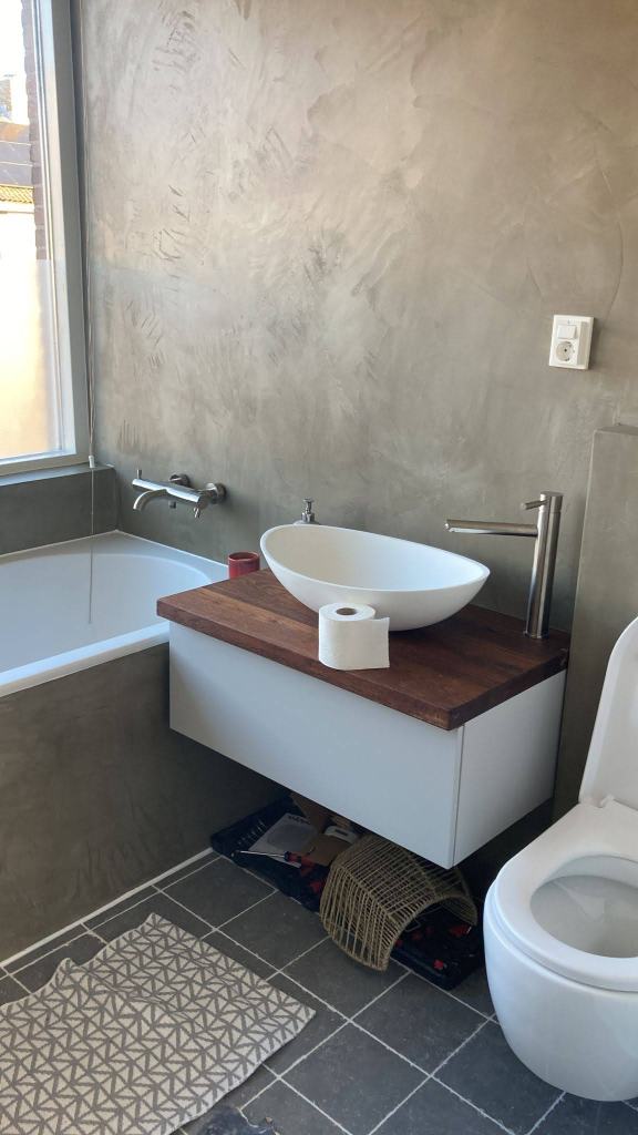 Beton ciré is een decoratieve stuc op basis van cement en wordt gebruikt voor vloeren, muren en werkbladen. Het mengsel bestaat uit cement, zand, hars en pigmenten, wat resulteert in een gladde,betonlook afwerking met een eigentijdse uitstraling. Beton ciré is duurzaam, waterdicht en gemakkelijk te onderhouden, waardoor het geschikt is voor zowel residentiële als commerciële toepassingen. Het kan worden aangebracht op verschillende ondergronden, waaronder tegels en gipsplaten, en biedt veelzijdige ontwerpmogelijkheden door zijn aanpasbare kleuren en texturen. Beton ciré wordt gewaardeerd om zijn moderne esthetiek en industriële flair, waardoor het een populaire keuze is in hedendaagse interieurontwerpen.